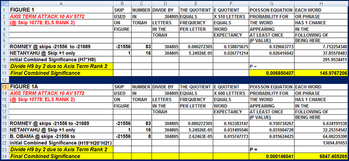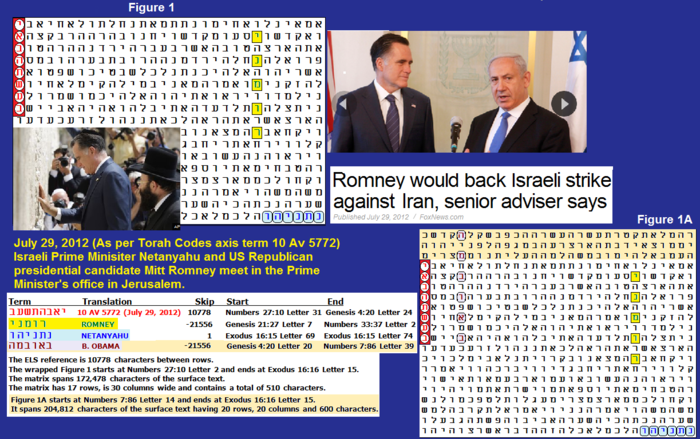 Full dates for events are rarely encoded for Torah. Earlier this month we saw an exception with the mass shooting by Holmes in Aurora, Colorado (see Figure 2 at BATMAN shooter). This is another example where on Figures 1 and 1A below 10 AV 5772 (July 29, 2012) is the axis term, ROMNEY is at twice the absolute skip of the axis term, and therefore parallel to it, and NETANYAHU is at skip +1. On this day Romney and Netanyahu are meeting. Figure 1A expands Figure 1 up by three rows, revealing B. OBAMA at the same skip as ROMNEY, but symbolically, not as close to NETANYAHU. ROMNEY and NETANYAHU are old friends who worked together in the 1970s at Boston Consulting Group. Let's hope that if ROMNEY is elected, the fact that he is encoded at the same skip as B. OBAMA does not translate into the same failed policies. However, Romney said he will do "the opposite" of what Obama would do in his approach to Israel.