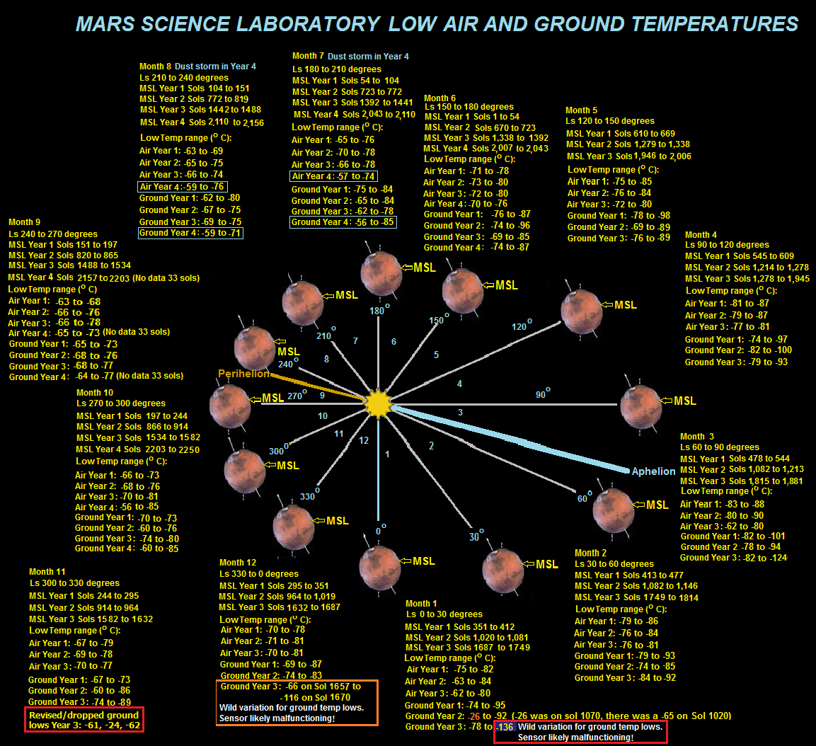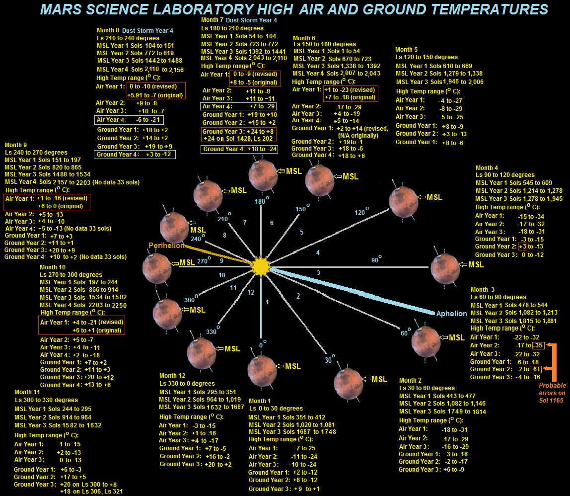 | Column A (Sol). The Martian day is about 39 minutes longer than the terrestrial day. Column B is solar longitude (Ls). MSL is in the Southern Hemisphere on Mars. The landing was at Ls 150 in winter. Ls 180 begins the spring there. Ls 270 starts summer, Ls 0 starts the fall. Ls 90 starts the winter. Column C shows the pressure reported by the REMS Team. Column D shows the date on Earth. Column E shows the maximum air temperature. With respect to the freezing point, from 0° C at 1 atm pressure it will increase up to 0.01° C at 0.006 atm (which is about the average pressure on Mars as given by NASA). This is the triple point of water. At pressures below this, water will never be liquid. It will change directly between solid and gas phase (sublimation). The temperature for this phase change, the sublimation point, will decrease as the pressure is further decreased Column F shows minimum air temperature. Column G shows the air temperature range for each sol. On Earth temperatures can vary by 40 °C in deserts. In column G where the range is 59 °C or less yellow background coloring points that out. The National Park Service claims the world record in a diurnal temperature variation is 102 °F (57 °C) (from 46 °F (8 °C) to −56 °F (−49 °C)) in Browning, Montana (elevation 4,377 feet/1,334 meters) on January 23 to 24, 1916. There were 2 days in Montana where the temperature changed by 57 °C. | Column H shows temperature range divided by 40. This allows us to compare terrestrial deserts with Gale Crater, Mars. How much cooling occurs at night is related to the density of the atmosphere. Here we see the ratio of cooling on a Mars sol to the typical 40 °C cooling figure for Earth's deserts shown with a green background when that ratio is under 1.5. For MSL Year 1 when we altered the devisor from 40 °C to 57 °C then 88 of the ratios were altered to 1 or less than 1, meaning that Martian air pressure is indeed likely much higher than NASA claims. Column I shows maximum ground temperature. As with terrestrial deserts, the ground on Mars heats more during the day than the air does, and it cools more at night than the air does. In Column K when the maximum ground temperature is given by REMS is above 0°C it is shown with a red background. Column J shows the minimum ground temperature. When it is -90 °C or colder the background is in purple. The ground temperatures are not very precise. The requirement was to measure ground brightness temperature over the range from 150 to 300 K with a resolution of 2 K and an accuracy of 10 K. Column K. Drop in ground temperature from day to night. Column L shows the increase in temperature from the mast 1.5 meters above the ground down to the ground during the daylight hours. In column N anytime there is an increase in temperature of 11 °C or more this in indicated with a dark blue background.