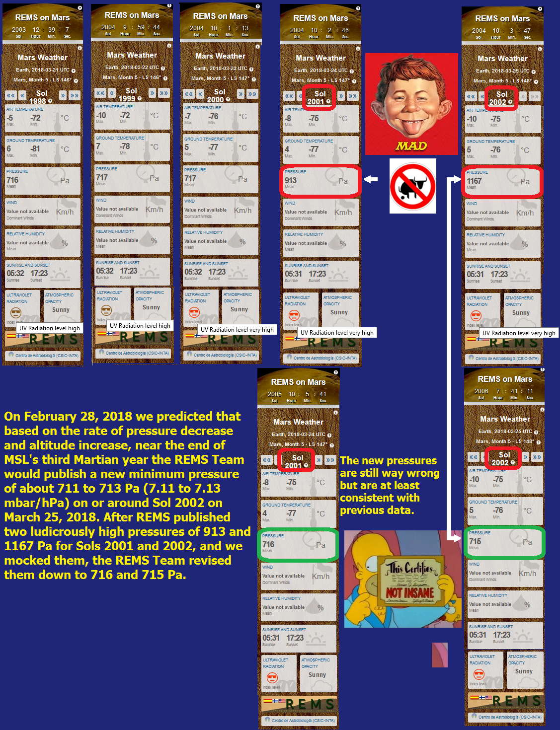 USING SCALE HEIGHTS TO ESTIMATE THE MINIMUM PRESSURE AT CURIOSITY AS IT CLIMBS MOUNT SHARP. Table 6 was taken from my MarsCorrect site on March 22, 2018. It shows that on February 28, 2018 we predicted that for the current Martian year minimum pressure would be reached at about 711 to 713 Pa around Ls 148 on March 25, 2018 (MSL Sol 2002). The Table indicates that the pressure at Curiosity had dropped (from 727 Pa at Ls 136 on February 28, 2018) to 715 Pa at Ls 148 on March 25, 2018. Announced pressures were running about 17 to 20 Pa less than the last Martian year due to an altitude increase as the lander climbs Mount Sharp. However we believe that the pressures offered by the REMS Team are false and that the real pressure is about 85 to 100 times higher. Our prediction of what the REMS Team has offered the public was based on how pressure should fall with scale height IF the average pressure on Mars is 610 Pa (6.1 mbar) at areiod. Columns A, B and C show the pressure for the current Martian year. Columns N and O show what the pressure was for the same solar longitude (Ls) in the previous Martian year, and how much the pressure has supposedly fallen since then. We offered the caveat: Over the last month Curiosity has not continued climbing, but has in fact has actually descended from -4,147 meters to about -4,159 meters. This may have caused a small impact on our prediction for the exact minimum pressure experienced by Curiosity this year. Note: the REMS Team had initially published a false pressure of 1,167 Pa for Sol 2,002, but corrected it after we published our mocking top half of Figure 1 below. The corrected Figures will be shown on the bottom half of Figure 1 below. If 715 Pa is in fact the minimum pressure then we picked correct day for the minimum pressure and missed the 2 Pa wide actual pressure by 2 Pa. That's accuracy within 0.02 mbar, really better because we made the prediction based on the assumption that Curiosity would not descend.