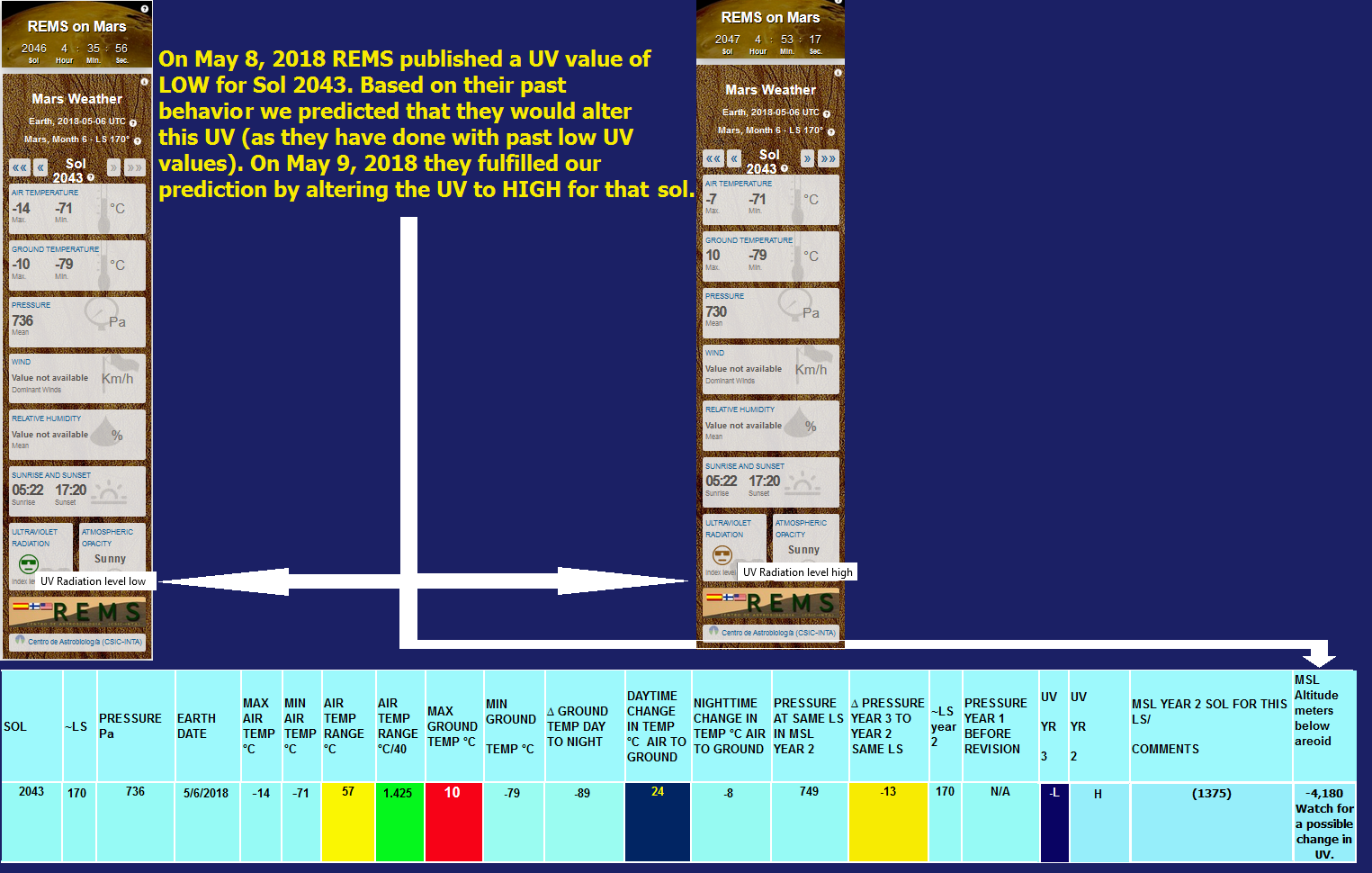 Figure 3 - As we predicted, REMS (or NASA) altered the low ultraviolet radiation originally published. Here it is changed to high. Low UV makes it easier to argue for a denser atmosphere, something that is politically incorrect to NASA Administration.